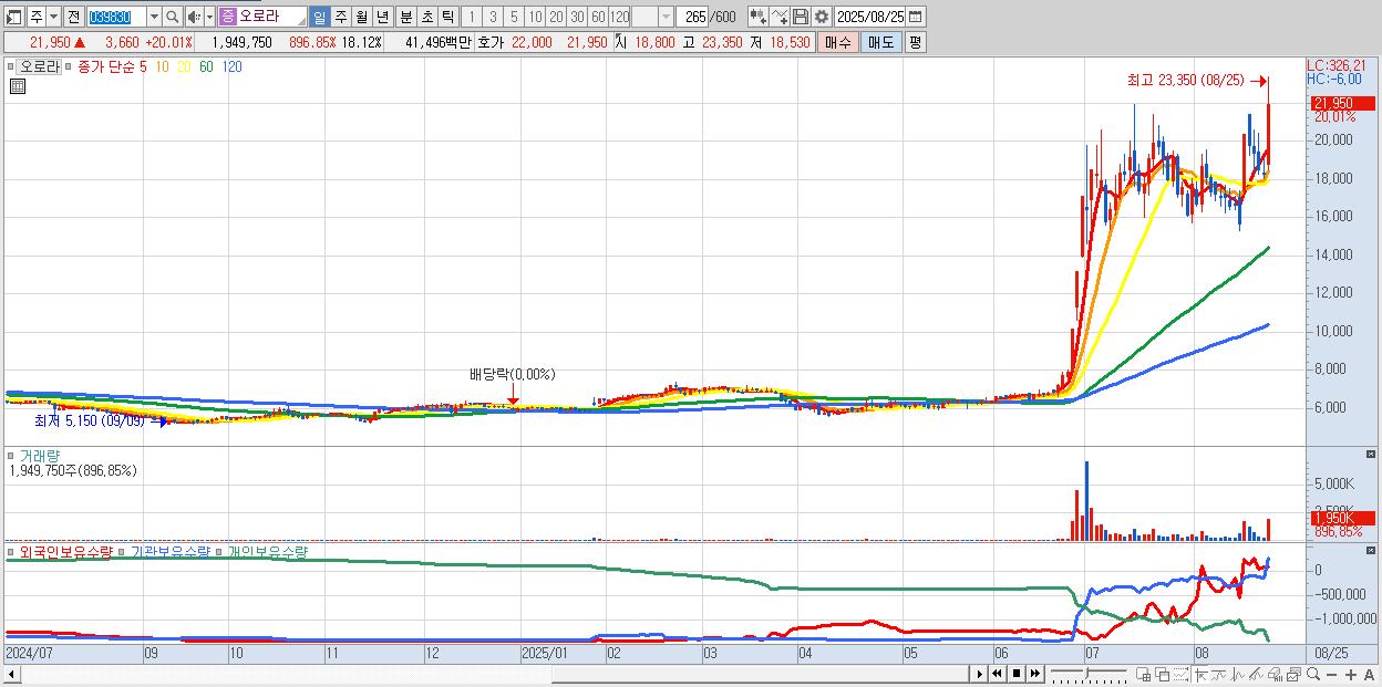 - 오로라 (21,950원 ▲ 20.01% , 시총: 2,362억, 거래량: 1,949,750, 거래대금:415억)