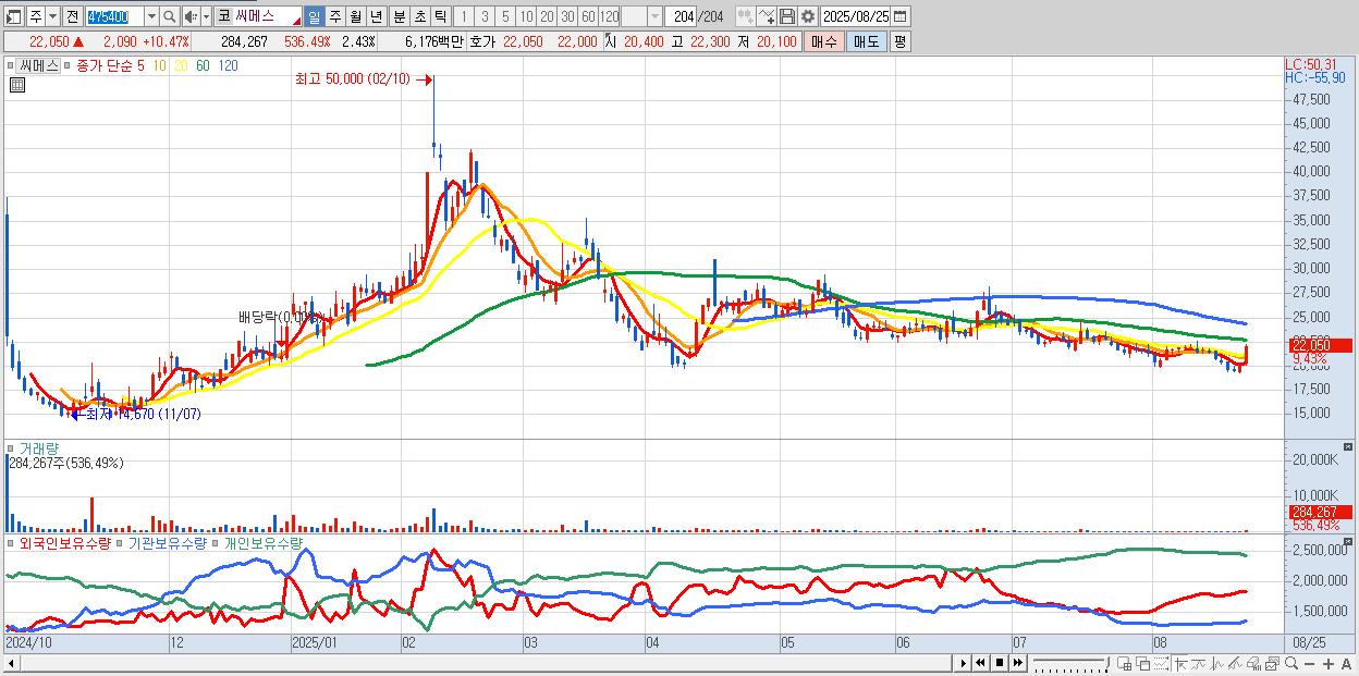 - 씨메스 (22,150원 ▲ 10.97% , 시총: 2,588억, 거래량: 145,610, 거래대금:32억)
