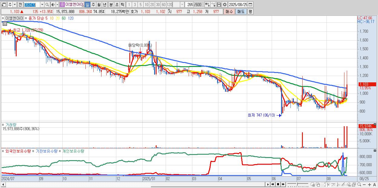 - 이엠앤아이 (1,103원 ▲ 13.95% , 시총: 235억, 거래량: 15,973,888, 거래대금:183억)