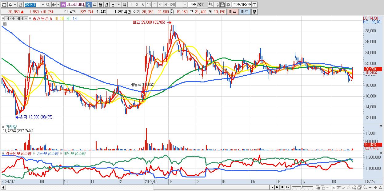 - 에스비비테크 (20,950원 ▲ 10.26% , 시총: 1,327억, 거래량: 91,423, 거래대금:19억)