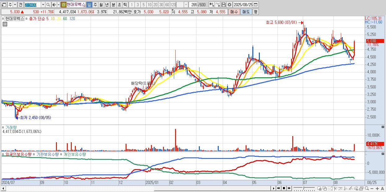 - 현대무벡스 (5,030원 ▲ 11.78% , 시총: 5,602억, 거래량: 4,417,034, 거래대금:219억)