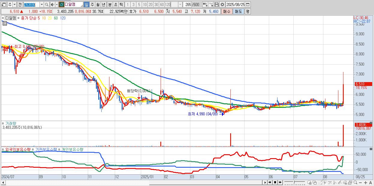 - 디알젬 (6,510원 ▲ 18.15% , 시총: 737억, 거래량: 3,483,205, 거래대금:229억)