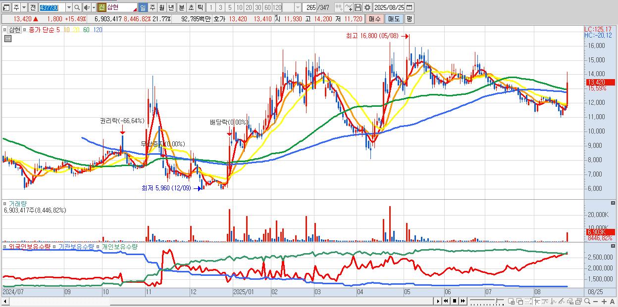 - 삼현 (13,450원 ▲ 15.75% , 시총: 4,265억, 거래량: 3,421,290, 거래대금:459억)