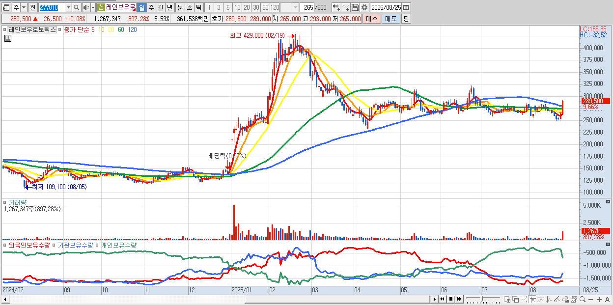 - 레인보우로보틱스 (289,500원 ▲ 10.08% , 시총: 56,163억, 거래량: 740,312, 거래대금:2,113억)