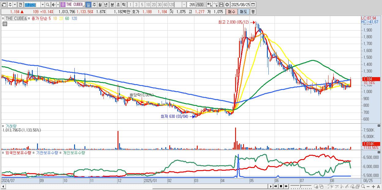 - THE CUBE& (1,184원 ▲ 10.14% , 시총: 720억, 거래량: 1,013,796, 거래대금:12억)