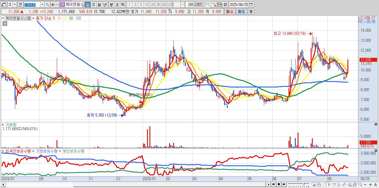 - 케이엔알시스템 (11,030원 ▲ 13.24% , 시총: 1,199억, 거래량: 1,171,669, 거래대금:126억)