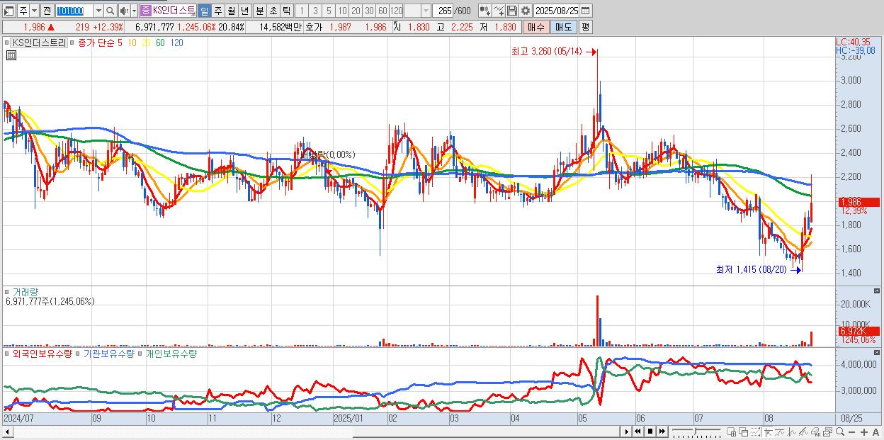 - KS인더스트리 (1,986원 ▲ 12.39% , 시총: 664억, 거래량: 6,971,777, 거래대금:146억)