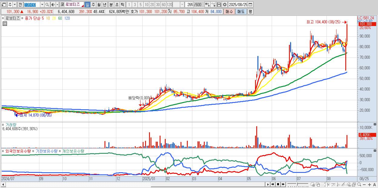 - 로보티즈 (100,700원 ▲ 19.31% , 시총: 13,313억, 거래량: 3,514,945, 거래대금:3,433억)