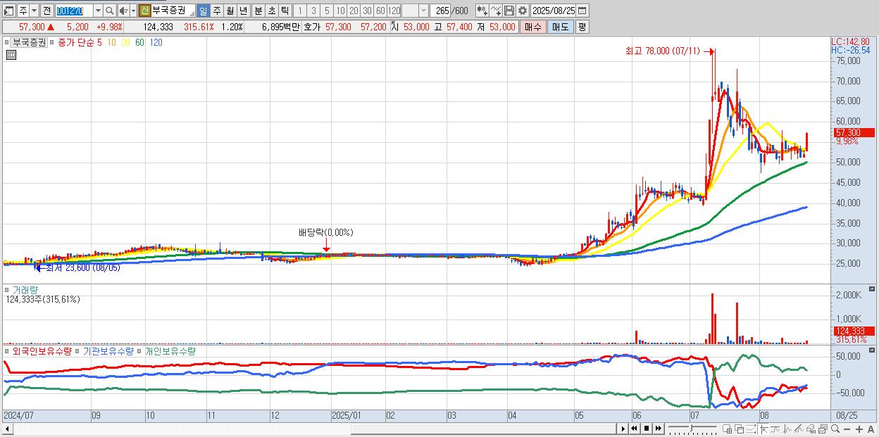 - 부국증권 (57,300원 ▲ 9.98% , 시총: 5,942억, 거래량: 124,333, 거래대금:69억)