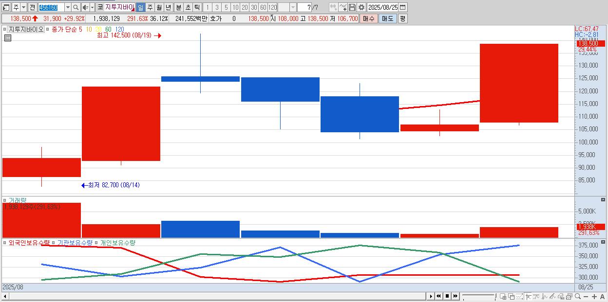 - 지투지바이오 (138,500원 ▲ 29.92% , 시총: 7,431억, 거래량: 994,132, 거래대금:1,239억)