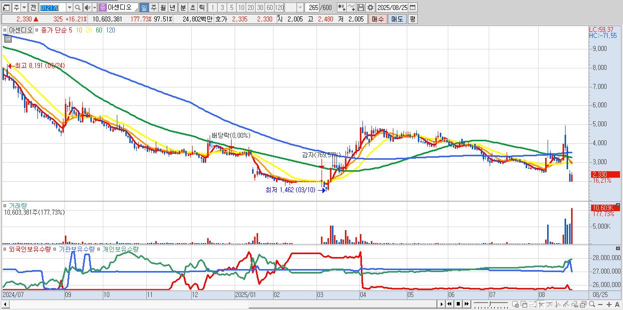 - 아센디오 (2,330원 ▲ 16.21% , 시총: 253억, 거래량: 10,603,381, 거래대금:248억)