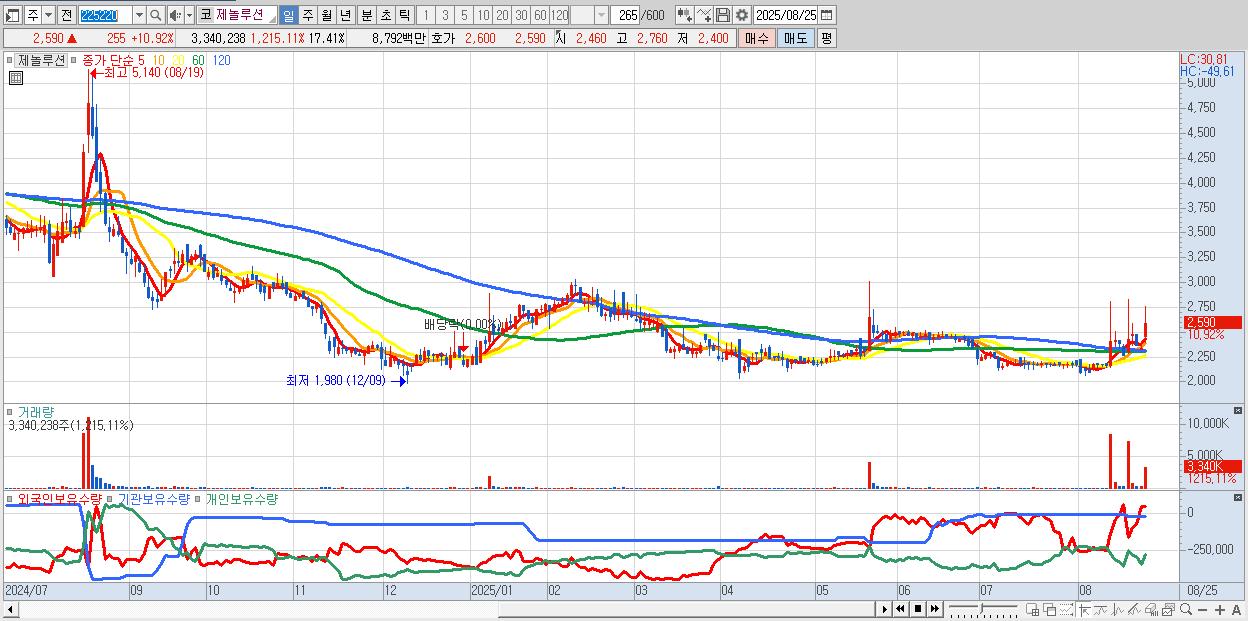 - 제놀루션 (2,590원 ▲ 10.92% , 시총: 497억, 거래량: 3,340,238, 거래대금:88억)