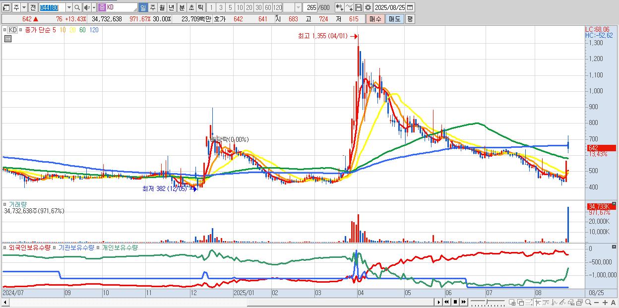 - KD (642원 ▲ 13.43% , 시총: 172억, 거래량: 34,732,638, 거래대금:237억)
