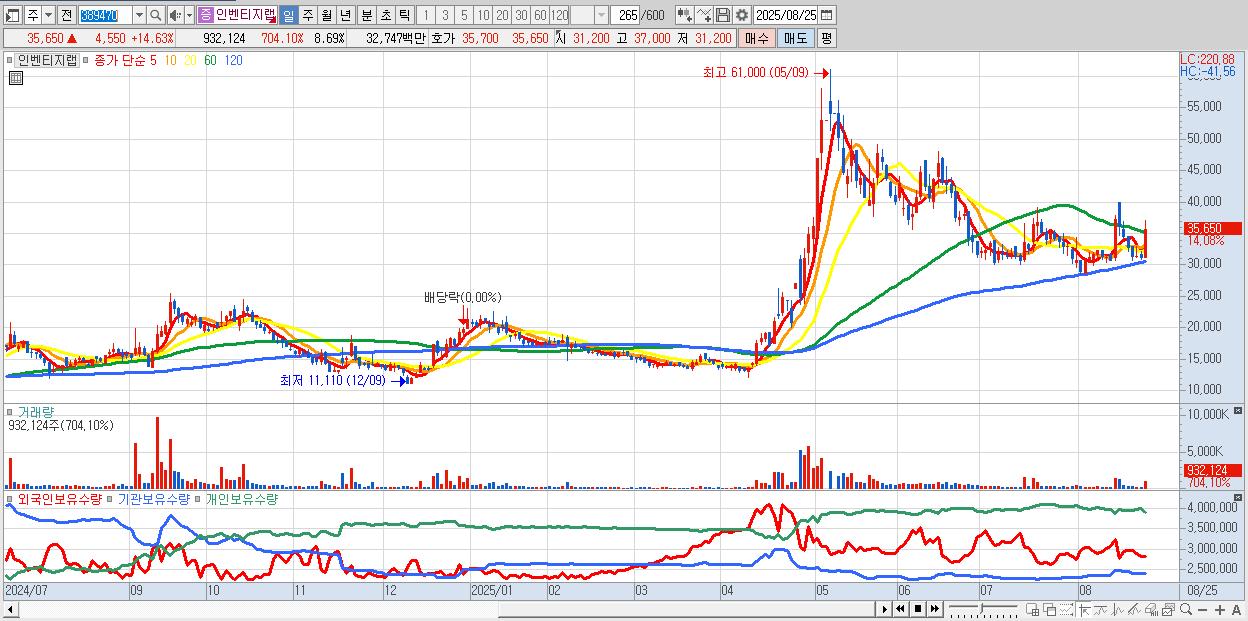 - 인벤티지랩 (35,950원 ▲ 15.59% , 시총: 3,857억, 거래량: 502,804, 거래대금:177억)