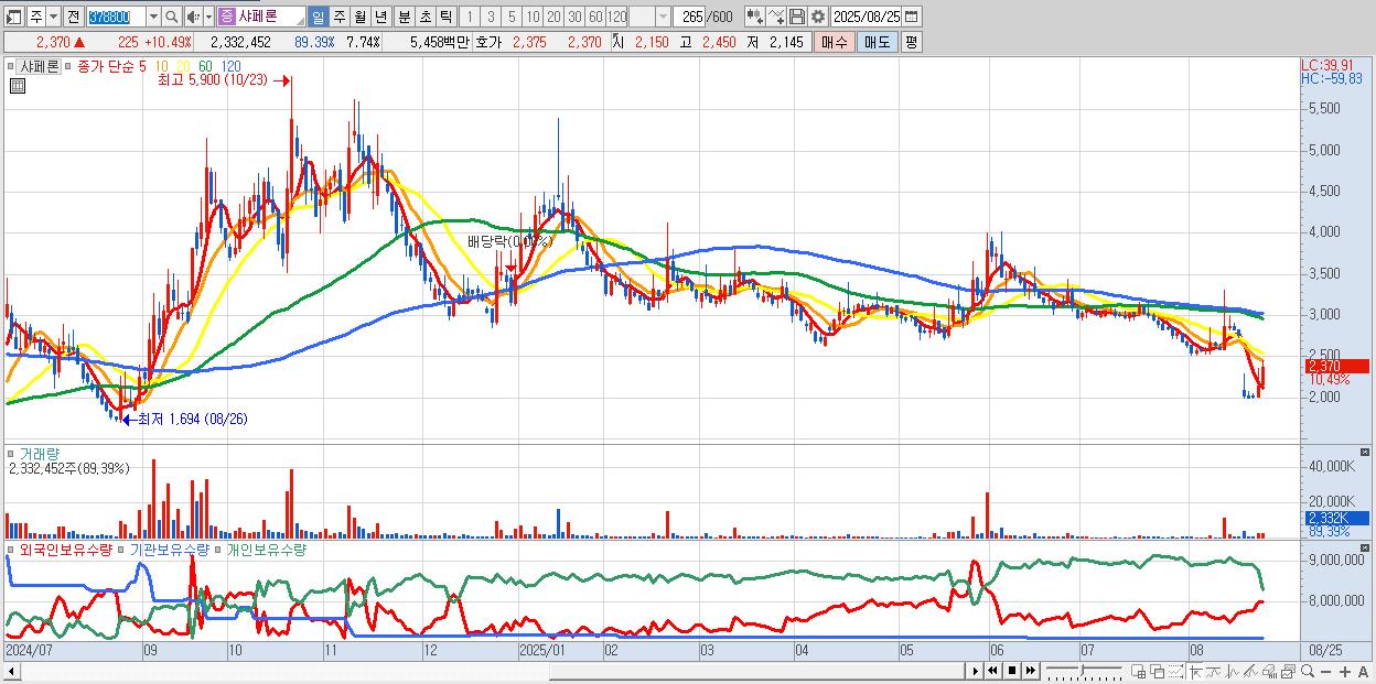- 샤페론 (2,370원 ▲ 10.49% , 시총: 714억, 거래량: 2,332,452, 거래대금:55억)
