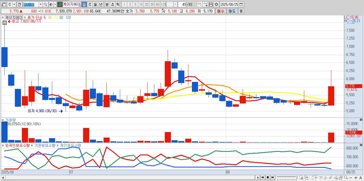 - 케이지에이 (5,770원 ▲ 11.61% , 시총: 698억, 거래량: 7,939,079, 거래대금:474억)