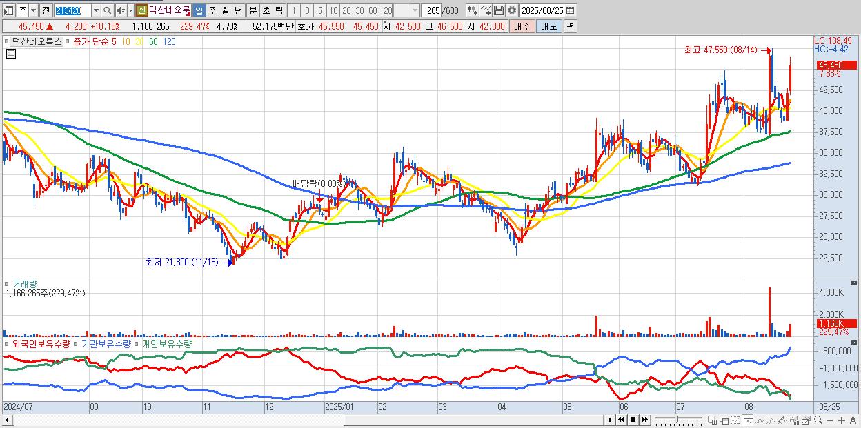 - 덕산네오룩스 (45,950원 ▲ 11.39% , 시총: 11,410억, 거래량: 780,384, 거래대금:350억)
