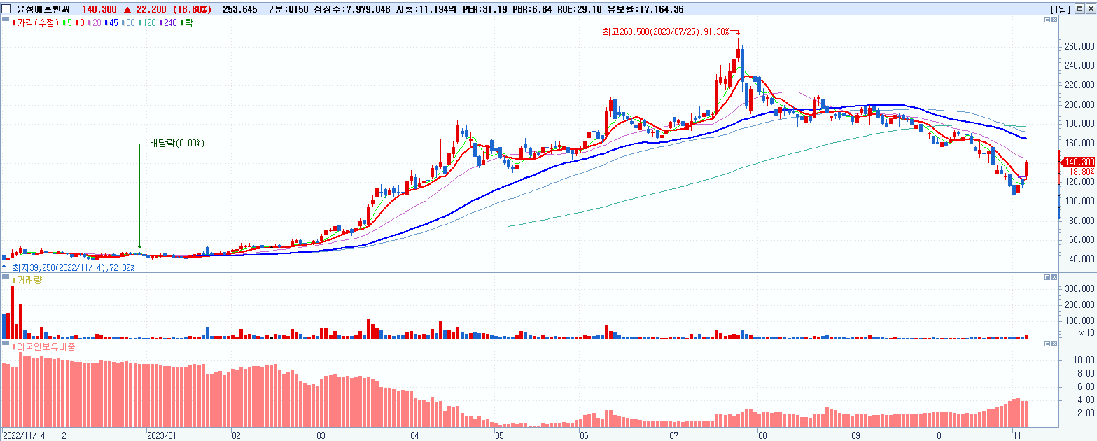 - 윤성에프앤씨 (140,300원 ▲ 18.8% , 시총: 11,195억, 거래량: 254,527, 거래대금:344억)