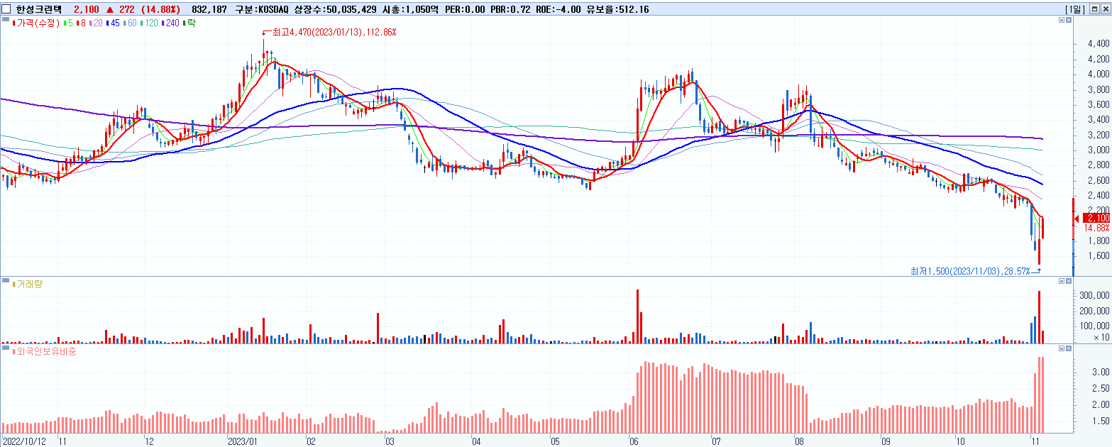 - 한성크린텍 (2,100원 ▲ 14.88% , 시총: 1,051억, 거래량: 836,091, 거래대금:16억)