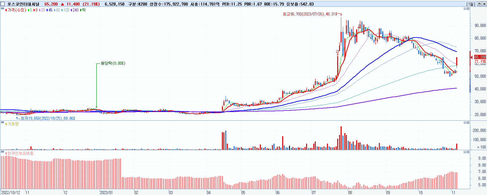 - 포스코인터내셔널 (65,200원 ▲ 21.19% , 시총: 114,702억, 거래량: 6,558,329, 거래대금:4,083억)