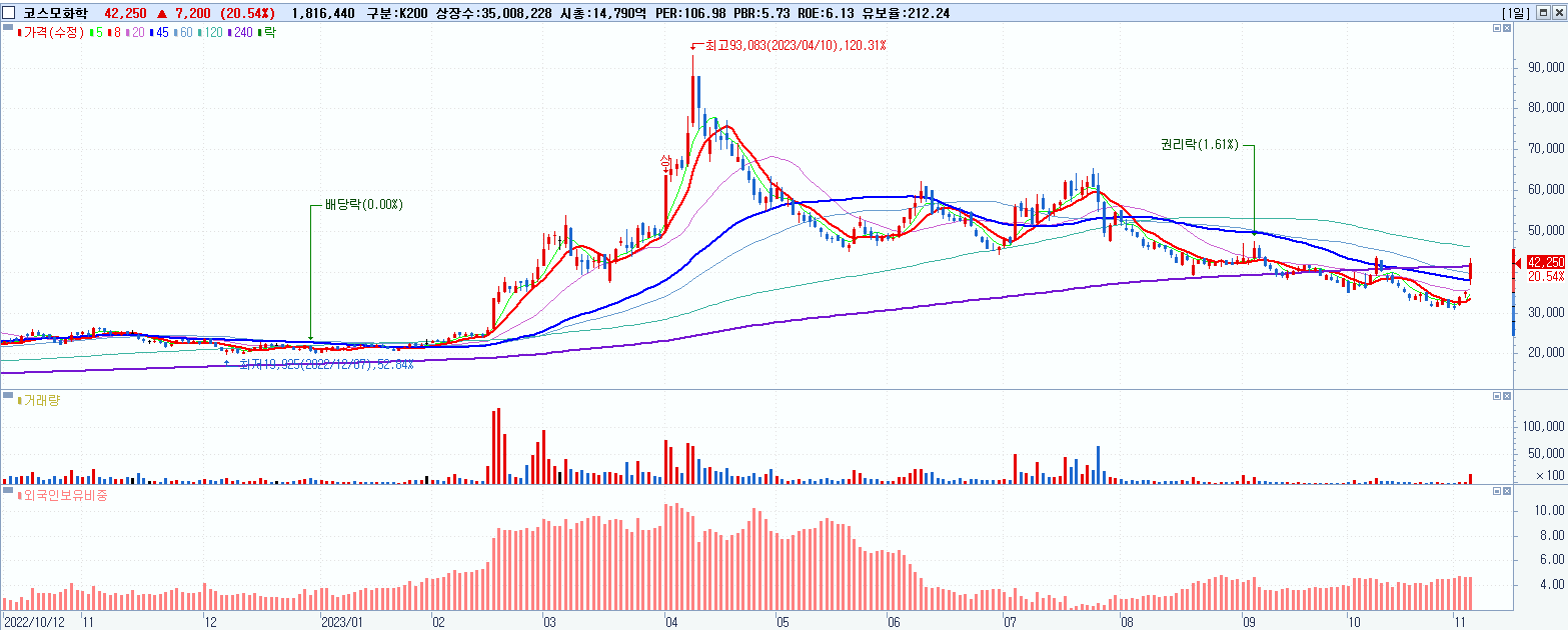 - 코스모화학 (42,250원 ▲ 20.54% , 시총: 14,791억, 거래량: 1,826,692, 거래대금:741억)