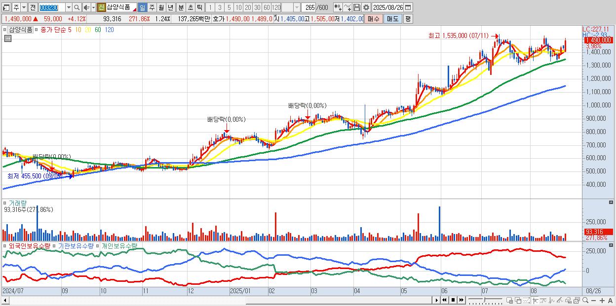 - 삼양식품 (1,501,000원 ▲ 4.89% , 시총: 113,071억, 거래량: 71,888, 거래대금:1,059억)