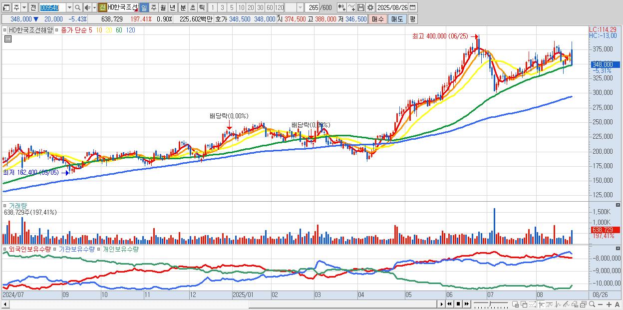 - HD한국조선해양 (347,000원 ▼ -5.71% , 시총: 245,583억, 거래량: 458,403, 거래대금:1,612억)