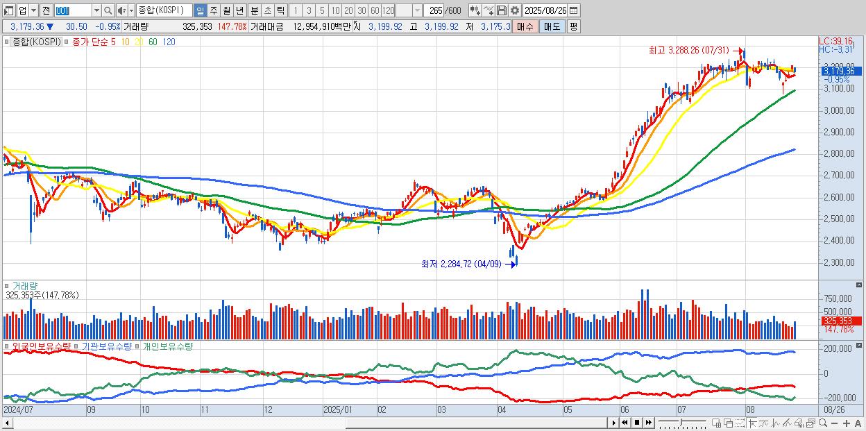 | 08/25 | 3,209.86 | ▲1.30% | -3,857억 | 1,224억 | 1,543억 | 1,089억 |