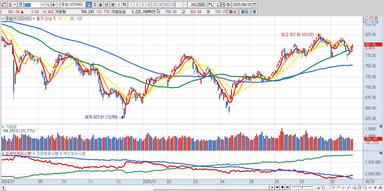 | 08/26 | 801.66 | ▲0.46% | -1,131억 | 1,603억 | -323억 | -148억 |