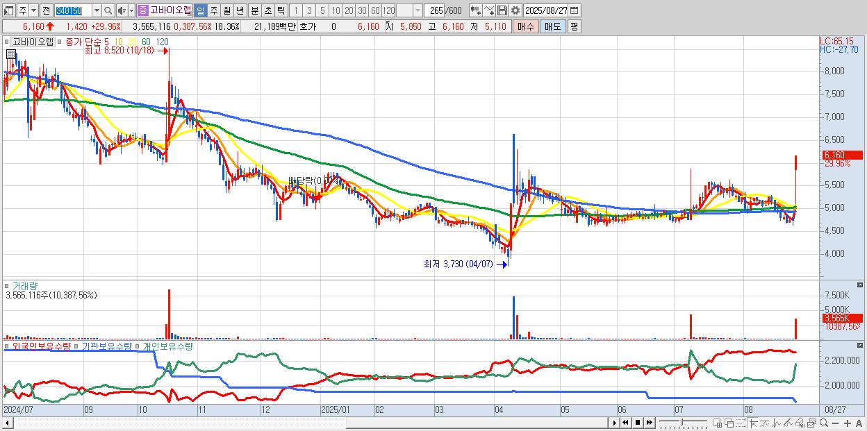 - 고바이오랩 (6,160원 ▲ 29.96% , 시총: 1,196억, 거래량: 3,565,116, 거래대금:212억)
