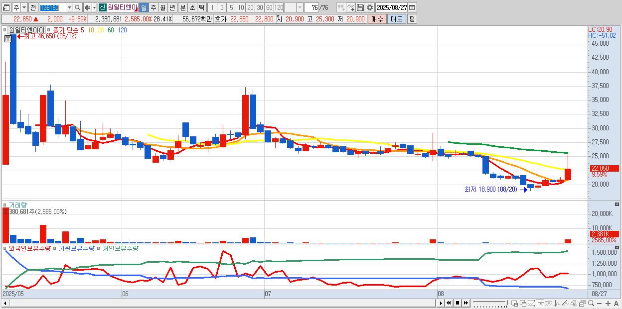 - 원일티엔아이 (22,750원 ▲ 9.11% , 시총: 1,907억, 거래량: 1,026,845, 거래대금:246억)