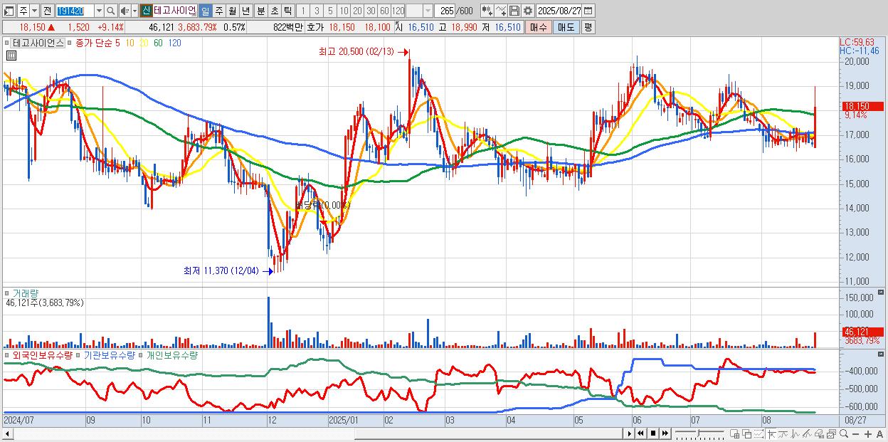 - 테고사이언스 (18,150원 ▲ 9.14% , 시총: 1,472억, 거래량: 46,121, 거래대금:8억)