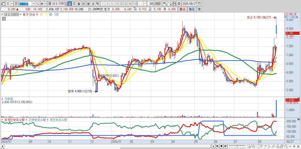 - 네오크레마 (8,240원 ▲ 9.14% , 시총: 1,043억, 거래량: 2,434,187, 거래대금:212억)
