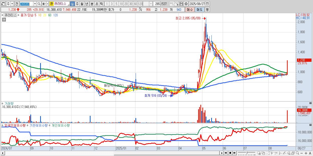 - 큐라티스 (1,238원 ▲ 29.91% , 시총: 914억, 거래량: 16,388,410, 거래대금:194억)