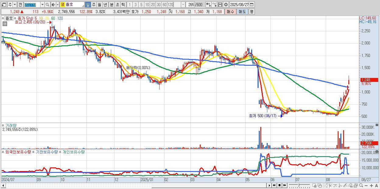- 율호 (1,248원 ▲ 9.96% , 시총: 898억, 거래량: 2,749,556, 거래대금:34억)