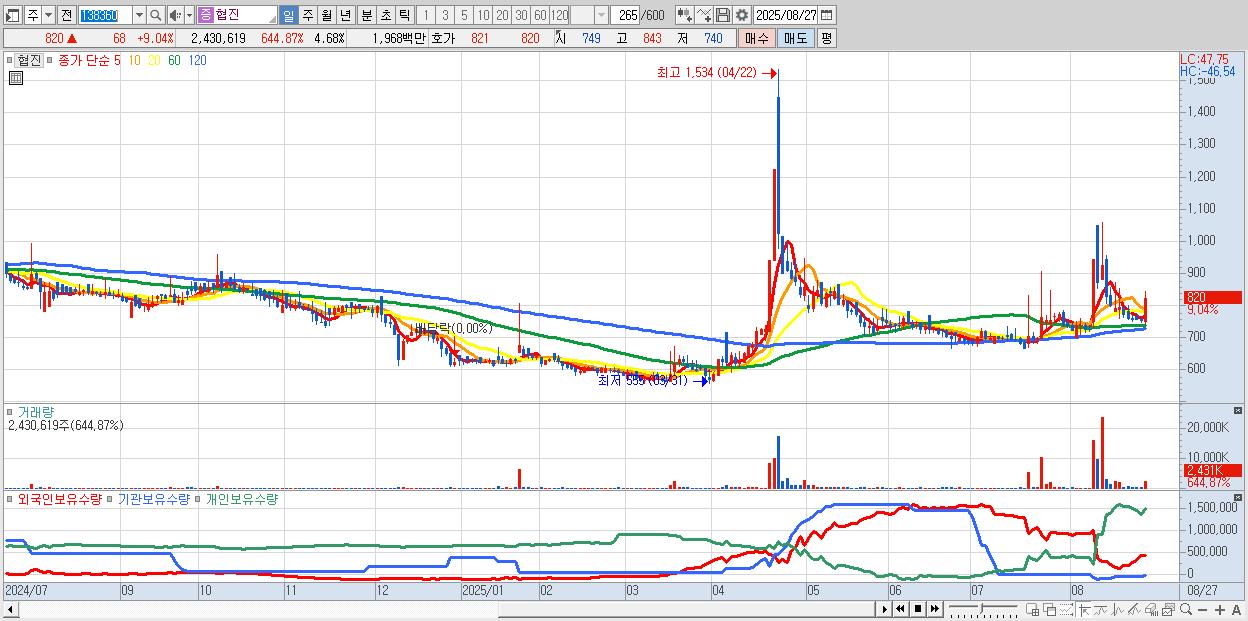 - 협진 (820원 ▲ 9.04% , 시총: 426억, 거래량: 2,430,619, 거래대금:20억)