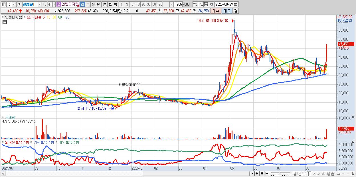 - 인벤티지랩 (47,450원 ▲ 30% , 시총: 5,091억, 거래량: 2,209,200, 거래대금:972억)