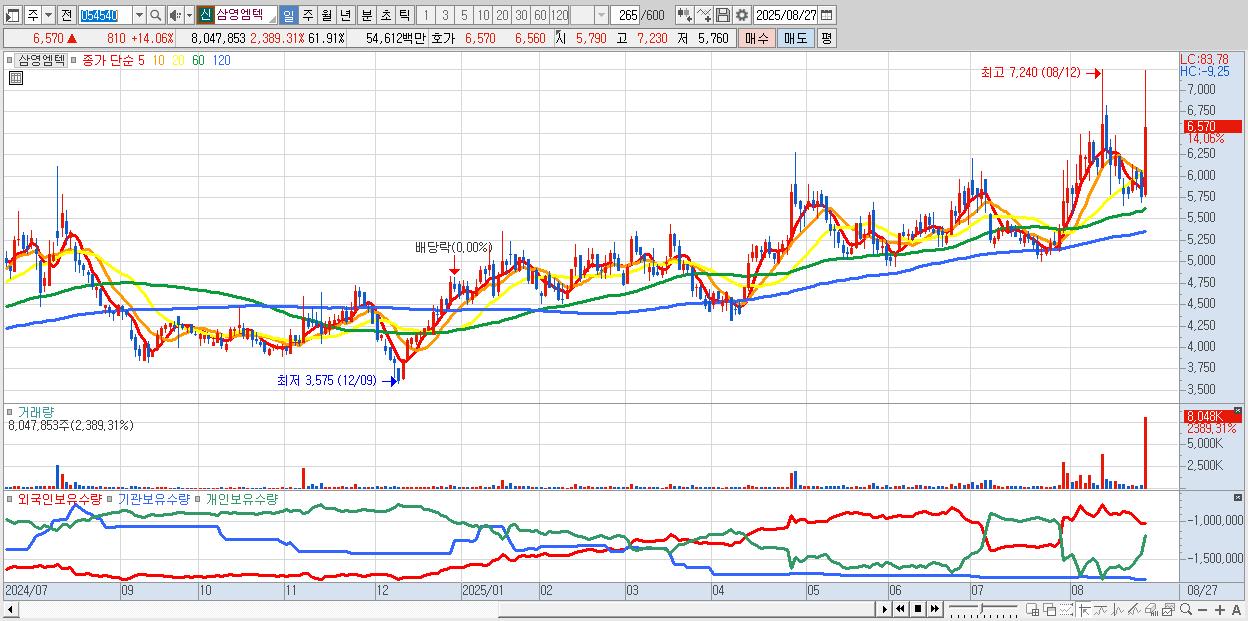 - 삼영엠텍 (6,570원 ▲ 14.06% , 시총: 854억, 거래량: 8,047,853, 거래대금:546억)