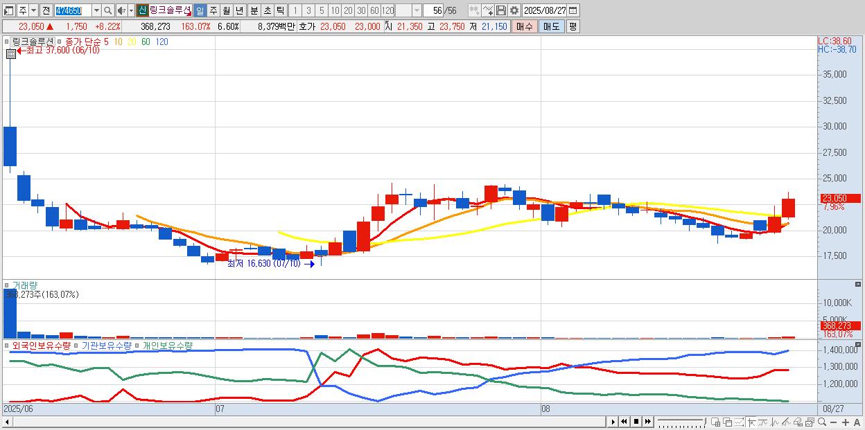 - 링크솔루션 (23,300원 ▲ 9.39% , 시총: 1,300억, 거래량: 246,158, 거래대금:56억)