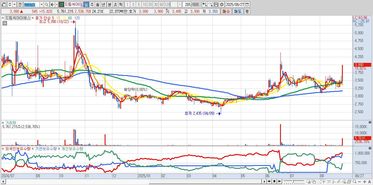 - 드림씨아이에스 (3,990원 ▲ 15.82% , 시총: 950억, 거래량: 5,761,215, 거래대금:221억)