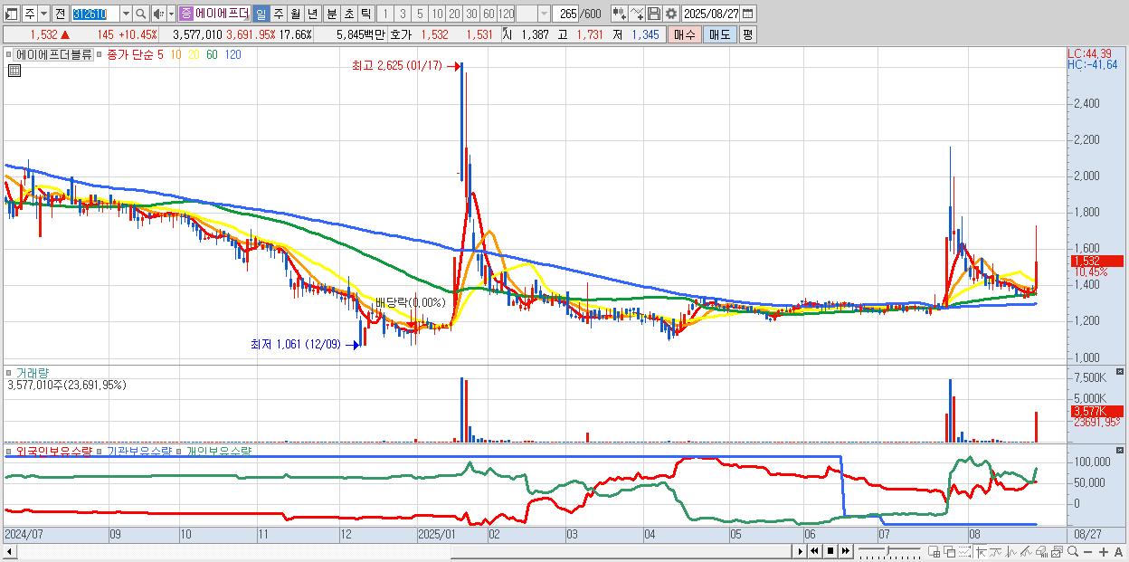 - 에이에프더블류 (1,532원 ▲ 10.45% , 시총: 310억, 거래량: 3,577,010, 거래대금:58억)
