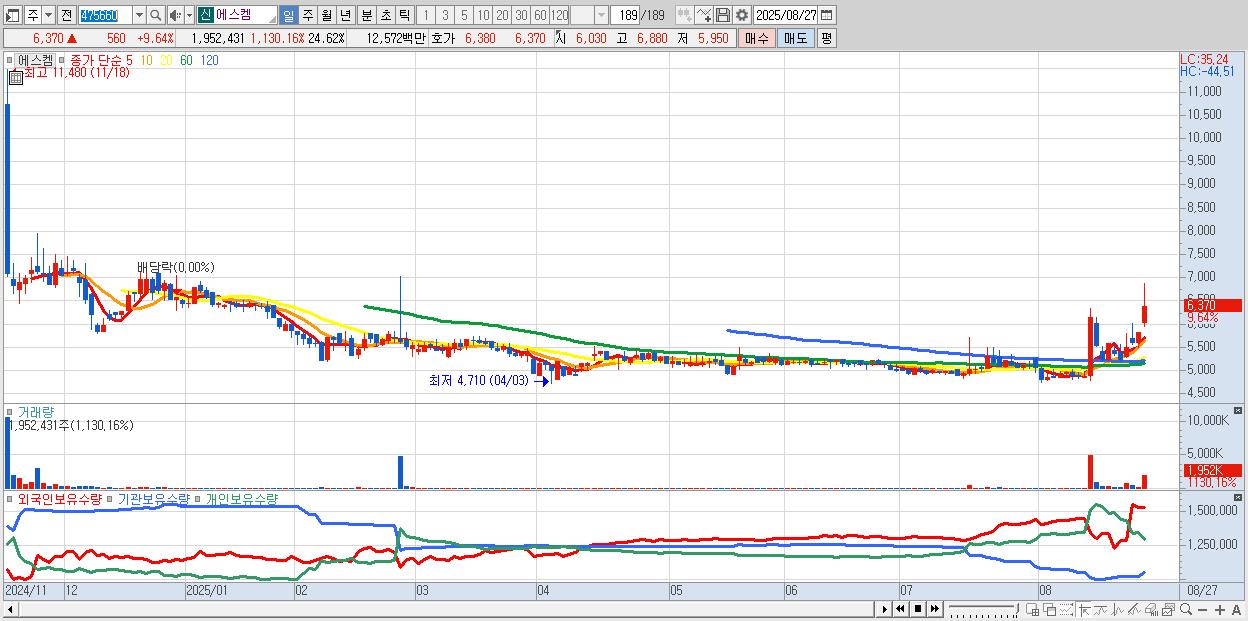 - 에스켐 (6,370원 ▲ 9.64% , 시총: 505억, 거래량: 1,952,431, 거래대금:126억)