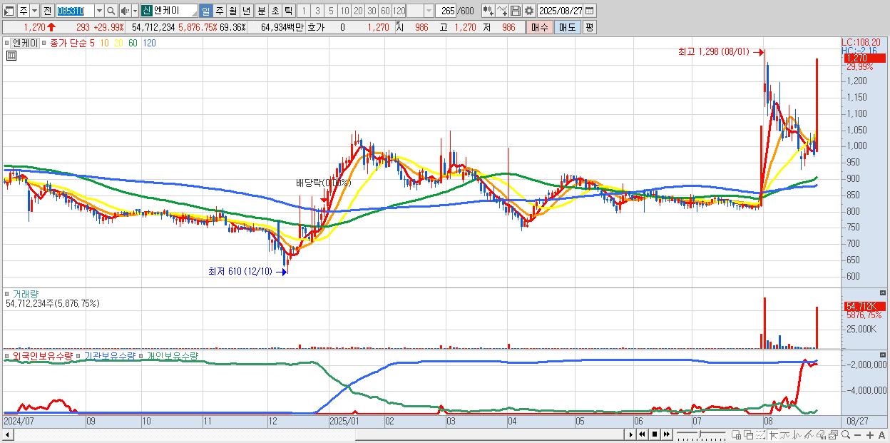 - 엔케이 (1,270원 ▲ 29.99% , 시총: 1,002억, 거래량: 54,712,234, 거래대금:649억)