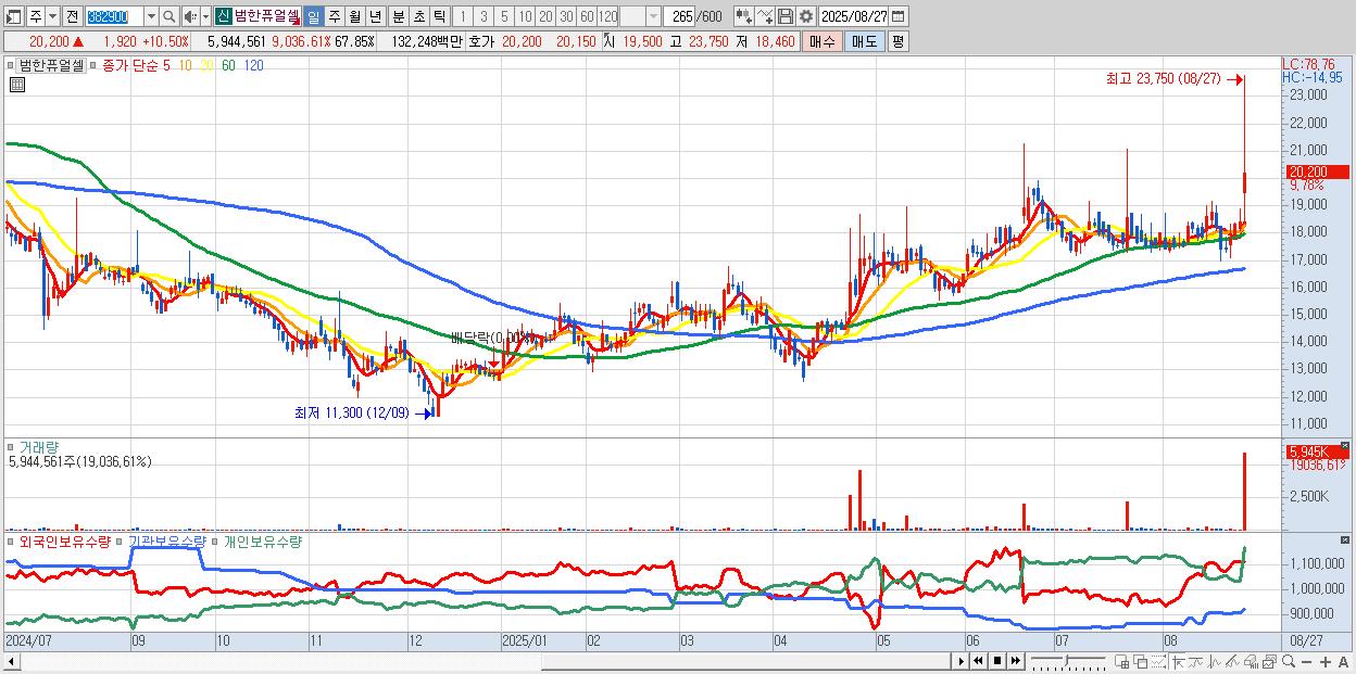 - 범한퓨얼셀 (20,400원 ▲ 11.6% , 시총: 1,787억, 거래량: 2,527,282, 거래대금:566억)