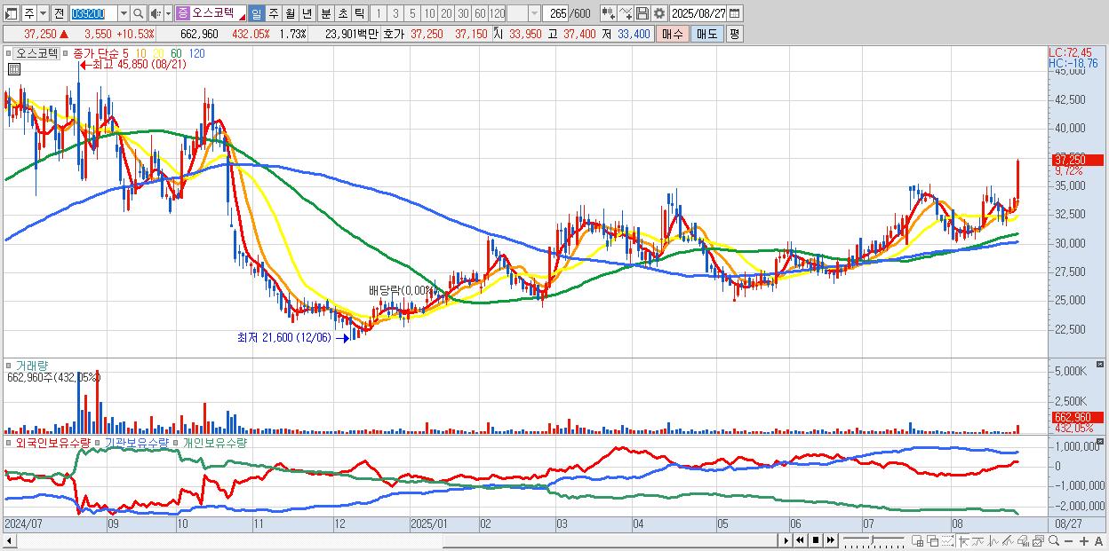 - 오스코텍 (37,000원 ▲ 9.79% , 시총: 14,154억, 거래량: 412,049, 거래대금:149억)