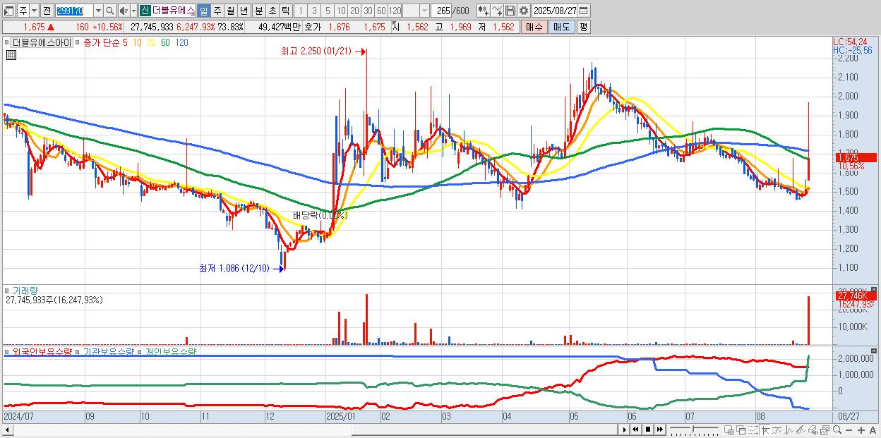 - 더블유에스아이 (1,675원 ▲ 10.56% , 시총: 629억, 거래량: 27,745,933, 거래대금:494억)