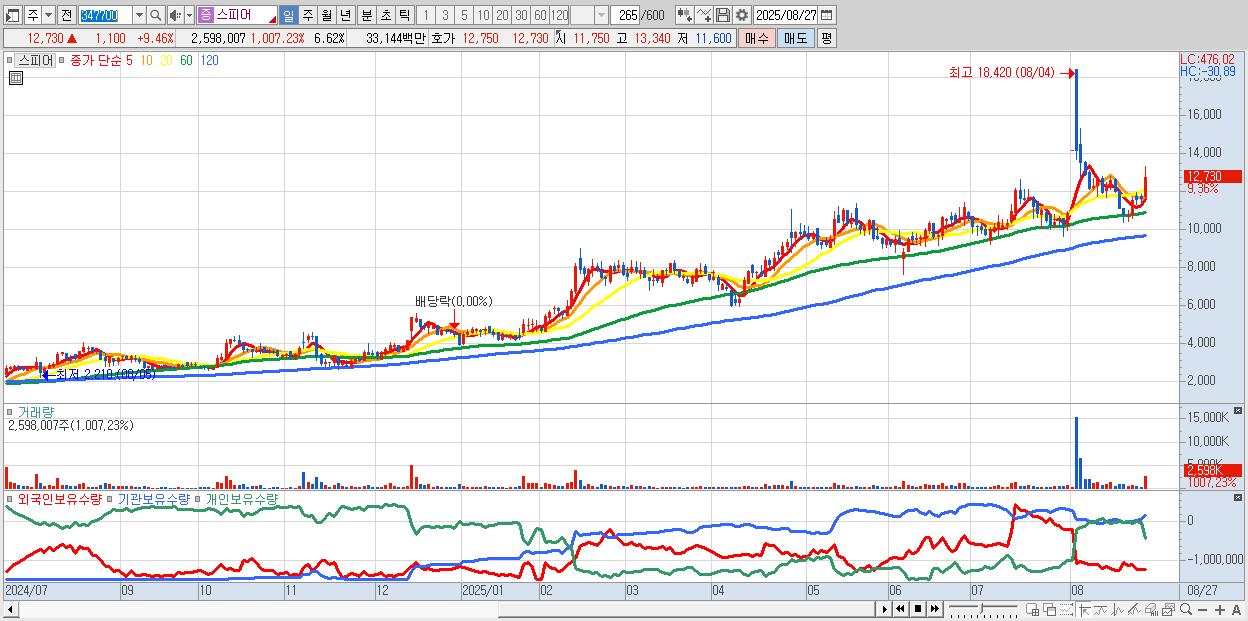 - 스피어 (12,720원 ▲ 9.37% , 시총: 4,990억, 거래량: 1,533,364, 거래대금:196억)