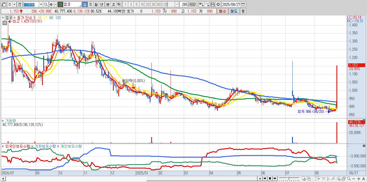 - 앱코 (1,153원 ▲ 29.99% , 시총: 584억, 거래량: 40,777,406, 거래대금:441억)