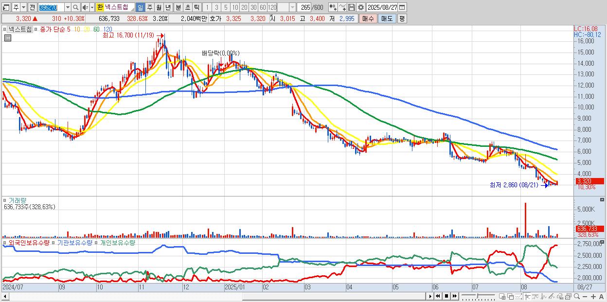- 넥스트칩 (3,320원 ▲ 10.3% , 시총: 661억, 거래량: 636,733, 거래대금:20억)