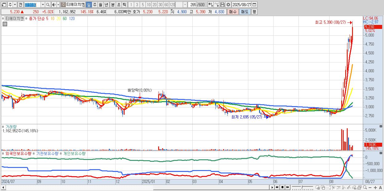 - 티에이치엔 (5,230원 ▲ 5.02% , 시총: 941억, 거래량: 1,162,952, 거래대금:60억, KOSPI)
